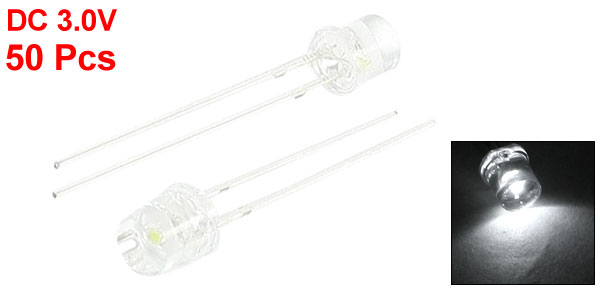 Product Name Light Emitting Diodes Emitting Light Color White Forward Voltage DC 3.0V 500mA Luminous Intensity 4000-6000 MCD Wavelength 520-525 nm Head Size(Approx) 5 x 5mm / 0.2" x 0.2"(D*H) Terminal Center Distance(Approx) 2mm / 0.078" Overall Height (Approx) 34mm / 1.3" Color White Material Plastic, Metal Weight 13g Package Content 50(±2%) Pcs x Light Emitting Diodes - Reviews