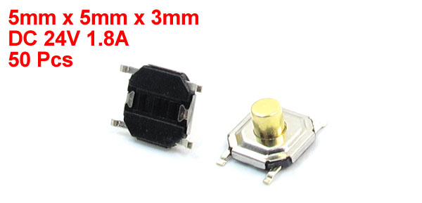 Product Name Tact Switch Acuion Type Momentary Rating Voltage & Current DC24V, 1.8A Switch Size 5 x 5 x 3mm / 0.2" x 0.2" x 0.12"(L*W*T) Material Plastic, Metal, Electric Parts Color Black, Gold Tone, Silver Tone Weight 7g Package Content 50Pcs(±2%) x Tact Switches - Reviews