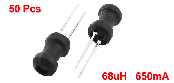 Details50Pcs 68uH 650mA 6x10mm 10% Tolerance Shielded Radial Lead Inductor Black  Product Name Radial Lead Inductor Inductance 68uH Rating Current 650mA Tolerance 10% Body Size 6 x 10mm / 0.24" x 0.39"(D*H) Lead Distance 3mm / 0.12" Color Black, Silver Tone Weight 53g Package Content 50(±2%) x Radial Lead Inductor