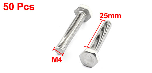 Product Name Hex Head Cap Screw Material A2-70 Stainless Steel Type M4 x 25mm Thread Dia 4mm/ 0.16"(M4) Thread Length 25mm / 1.0" Head Dia 8mm / 0.31" Color Silver Tone Weight 137g Package Content 50 x Hex Head Cap Screw - Reviews
