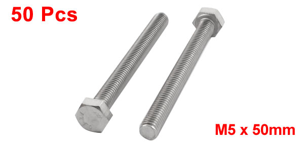 Product Name Hex Head Cap Screw Material A2-70 Stainless Steel Type M5 x 50mm Thread Dia 5mm/ 0.20"(M5) Thread Length 50mm / 2.0" Head Dia 9mm / 0.35" Color Silver Tone Weight 269g Package Content 50 x Hex Head Cap Screw - Reviews