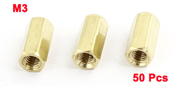 Details50Pcs M3 Male Thread Hex Standoff Hexagonal Spacer  Product Name Standoff Hexagonal Spacer Thread Size M3 Female Body Length 10mm/ 0.39" Total Size(Approx.) 10 x 4.5mm/ 0.39" x 0.06" (L*Max.D) Material Brass Color Gold Tone Net Weight 53g Package Content 50(±2%) x Standoff Hexagonal Spacer
