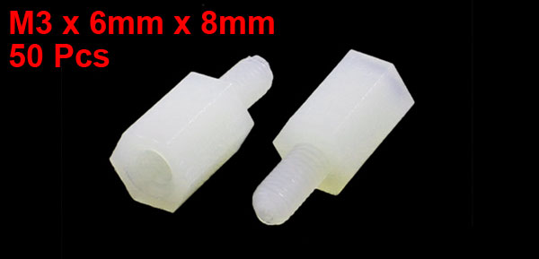 Product Name Hexagonal Threaded Spacer Thread Size M3 Thread Length 6mm Tube Length 8mm Total Size 14 x 6mm / 0.55" x 0.24" (H*D) Material Nylon Color White Net Weight 14g Package Content 50pcs(±2%) x Hexagonal Threaded Spacer  - Reviews
