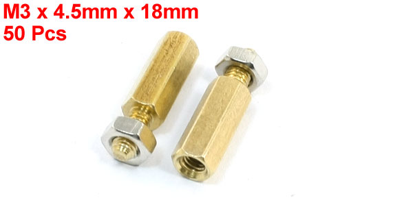 Product Name Standoff Hexagonal Spacer Thread Size M3 Male x M3 Female Male Thread Length 6mm/ 0.24" Body Length 12mm/ 0.47" Total Size(Approx.) 18 x 4.5mm/ 0.7" x 0.06" (L*Max.D) Material Brass Color Gold Tone Net Weight 98g Package Content 50 (±2%) x Standoff Hexagonal Spacer