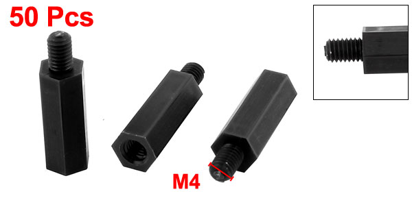 Product Name Hexagon Standoff Spacer Thread Size M4 Male Thread Length 6mm/0.24" Hex Part Length 19mm/0.75" Total Size 25 x 7mm/1" x 0.28"(L*W) Material Nylon Color Black Net Weight 82g Package Content 50(+/-2%) x Hexagon Standoff Spacers - Reviews