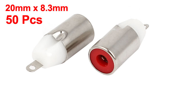 Main Color Silver Tone, White, Red Net Weight 54g Total Length 20mm/ 0.8" Country of Manufacture CHINA Package Content 50pcs(+/-2%) x RCA Female Connectors Diameter(Approx) 8.3 x 3.3mm/ 0.33" x 0.13"(Outer D*Inner D) Material Metal, Plastic - Reviews