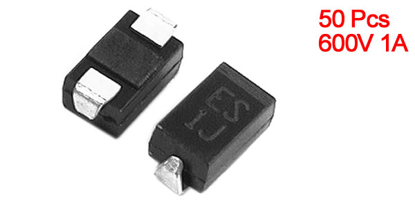 Product Name Ultra Fast Diode Model ES1J Package Type DO-214AC (SMA) Max Repetitive Peak Reverse Voltage 600V Max Average Forward Rectified Current 1A Size 5 x 2.5 x 2.2mm / 0.2" x 0.1" x 0.087" (L*W*T) Color Silver Tone, Black Weight 15g Package Content 50 (±2%) x Ultra Fast Diode - Reviews