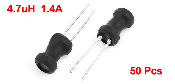 Product Name Inductor Inductance 4.7uH Rating Current 1.4A Tolerance 10% Body Size 6 x 10mm / 0.24" x 0.4"(D*H) Pin Size 0.5 x 15mm/ 0.02" x 0.6"(D*L) Lead Distance 2.3mm / 0.09" Color Black, Silver Tone Weight 47g Package Content 50Pcs(+/-2%) x Inductors - Reviews