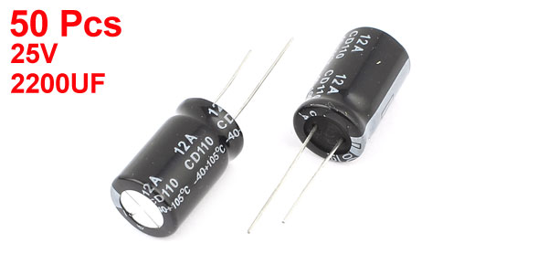 Product Name Electrolytic Capacitor Type Radial Leads Temperature Range -40~+105°C Voltage 25V Capacitance 2200uF Body Size 13 x 20mm/0.5" x 0.8"(D*H) Lead Space 5mm/0.2" Lead Length 21mm/0.8" , 25mm/1" External Material Aluminum Total Net Weight 198g Main Color Black Package Content 50(+/-2%)x Electrolytic Capacitors - Reviews