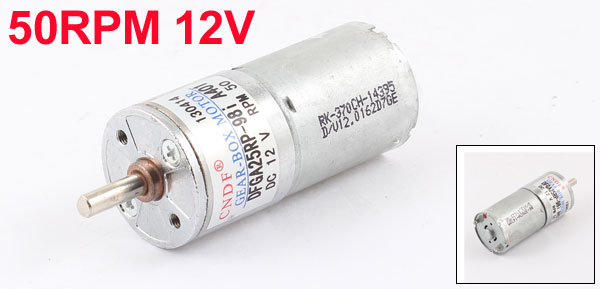 Product Name DC Motor Rated Voltage DC 12V Speed 50 RPM Mounting Screw Hole Diameter 1mm/0.04" Shaft Size 4 x 12mm/ 0.16" x 0.47"(D*L) Body Size 24 x 53mm/ 0.94" x 2.1" (D*H) Main Color Silver Tone Material Metal Net Weight 92g Package 1 x DC Motor - Reviews