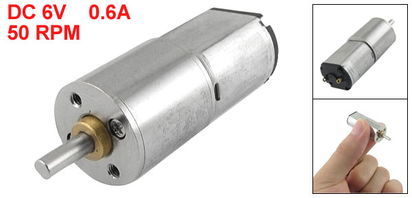 Product Name DC Geared Motor Rated Voltage DC 6V Rated Current 0.6A ( no load ) Speed 50 RPM Shaft Diameter 3mm/ 0.118" Gearbox Size 16 x 13mm/ 0.63" x 0.51" (D*H) Overall Size 16 x 47mm/ 0.63" x 1.8" (D*H) Main Color Silver Tone Material Metal Weight 24g Package 1 x DC Geared Motor - Reviews