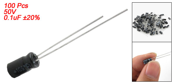Product Name Aluminum Electrolytic Capacitor Type Radial Lead Maximum Temperature 105°C Voltage 50V Capacitance 0.1uF Capacitance Tolerance ±20% Body Size 4 x 7mm/0.16'' x 0.28'' (D*L) Lead Spacing 2mm/0.08'' Lead Length 25mm/1'', 20mm/ 0.79'' External Material Aluminum Weight 24g Color As Picture Shown Package Content 100 Pcs (±2%) x Electrolytic Capacitors - Reviews