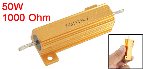 Product Name Aluminium Clad Resistor Power Rating 50W Resistance Value 1000 Ohm Resistance Tolerance ± 5% Mounting Hole Dia. 0.3cm / 0.118" Mounting Hole Spacing 4cm / 1.6" Case Size (Exclude Tabs) 5 x 1.6 x 1.5cm / 2" x 0.63" x 0.59" (L*W*H) Overall Size (Approx.) 7.3 x 2.8cm / 2.9" x 1.1" (L*W) Case Material Aluminum Case Color Gold Tone Net Weight 26g Package Content 1 x Aluminium Clad Resistor - Reviews