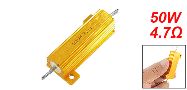 Product Name Aluminium Clad Resistor Power Rating 50W Resistance Value 4.7 Ohm Resistance Tolerance ± 5% Mounting Hole Dia. 0.3cm / 0.118" Mounting Hole Spacing 4cm / 1.6" Case Size (Exclude Tabs) 5 x 1.6 x 1.5cm / 2" x 0.62" x 0.59" (L*W*H) Overall Size (Approx.) 7.4 x 2.8cm / 2.9" x 1.1" (L*W) Case Material Aluminum Case Color Gold Tone Net Weight 25g Package Content 1 x Aluminium Clad Resistor - Reviews