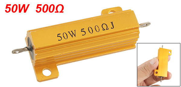 Product Name Aluminium Clad Resistor Power Rating 50W Resistance Value 500 Ohm Resistance Tolerance ± 5% Mounting Hole Dia. 0.4cm / 0.157" Mounting Hole Spacing 4cm / 1.6" Case Size (Exclude Tabs) 5 x 1.7 x 1.5cm / 2" x 0.67" x 0.59" (L*W*H) Overall Size (Approx.) 6.8 x 3cm / 2.7" x 1.2" (L*W) Case Material Aluminum Case Color Gold Tone Net Weight 26g Package Content 1 x Aluminium Clad Resistor - Reviews