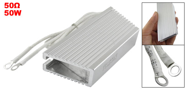 Details50W 50ohm Aluminum Housing Braking Resistor Resistance  Product Name Braking Resistor Resistance Value 50 Ohm Rated Power 50W Resistance Tolerance ± 5% (J) Overall Size(Approx) 9.5 x 4 x 1.9cm / 2.7" x1.6 " x 0.75"(L*W*T) Cable Size 32.5 x 0.23cm / 12.8" x 0.09"( L*OD) Installing Holes Size(Approx) 1 x 0.5cm / 0.393" x 0.196"(L*W) Terminals Size(Approx) 0.65 x 0.38cm / 0.256" x 0.15"(OD*Inner D) External Material Aluminum Color Silver Tone Net Weight 130g Package Content 1 x Braking Resistor