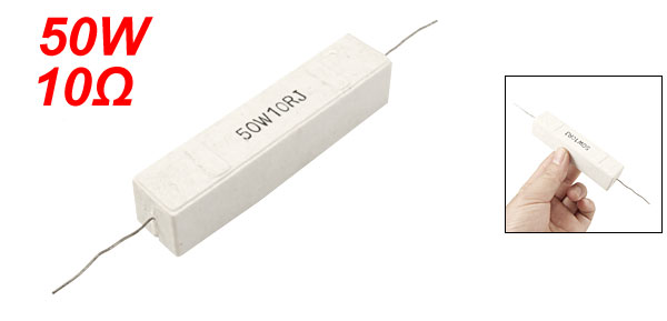 Product Name Cement Resistor Body Material Ceramic, Cement Power 50W Resistance 10Ω Tolerance ±5% Body Size (Approx.) 88 x 18 x 18mm / 3.4" x 0.7" x 0.7" (L * W * H) Lead Diameter (Approx.) 0.8mm / 0.031" Lead Length (Approx.) 33mm / 1.3" Color White Weight 63g Package Content 1 x Cement Resistor - Reviews