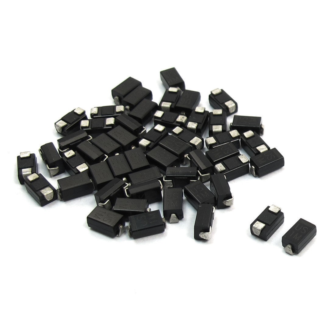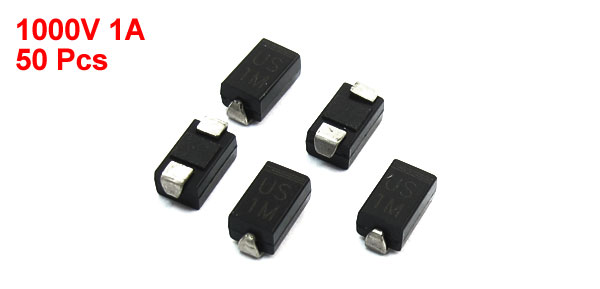 Product Name High Efficiency Rectifier Diode Model US1M Package Type DO-214AC Max Repetitive Peak Reverse Voltage 1000V Max Average Forward Rectified Current 1A Size 5 x 2.5 x 2.2mm / 0.2" x 0.1" x 0.087" (L*W*T) Color Silver Tone, Black Weight 6g Package Content 50 (±2%) x High Efficiency Rectifier Diode - Reviews