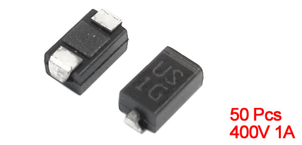 Product Name High Efficiency Rectifier Diode Model US1G Package Type DO-214AC Max Repetitive Peak Reverse Voltage 400V Max Average Forward Rectified Current 1A Size 5 x 2.5 x 2.2mm / 0.2" x 0.1" x 0.087" (L*W*T) Color Silver Tone, Black Weight 6g Package Content 50 (±2%) x High Efficiency Rectifier Diode - Reviews