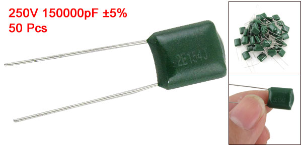 Product Name Polyester Film Capacitors Quantity 50±2% Pcs Model 2E154J Withstand Voltage 250V Capacitance 150000pF Capacitance Tolerance ±5% Lead Spacing 7mm/ 0.276" Lead Diameter 0.4mm/ 0.015" Total Size (Approx.) 36 x 9 x 4mm/ 1.4" x 0.35" x 0.16" (L*W*T) Weight 60g Main Color As Picture Shown Package Content 50 Pcs x Polyester Film Capacitors - Reviews