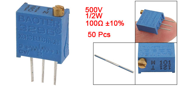 Product Name Cermet Potentiometer Model 3296W-1-101 Quantity 50±2% Pcs Withstand Voltage 500V Rated Power 1/2W Resistance Value 100 Ohm Tolerance ±10% Adjustment Tyoe Top Adjustment Mounting Type Through Hole(DIP) Turn Number 25 Resistance Change Type Linear Resistive Material Cermet Temperature Coefficient ±100ppm/°C Square Body Size 9 x 9mm/ 3/8" x 3/8" (L*W)