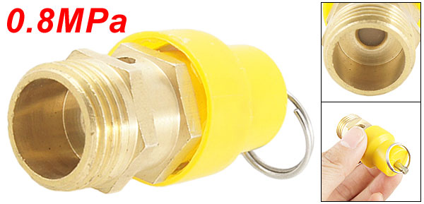 Product Name Pressure Relief Valve Material Plastic, Metal Color Yellow, Gold Tone Working Pressure 8 Kg (0.8MPa ) Thread Diameter 2.03cm / 51/64" Ring Diameter 1.5cm / 19/32" Valve Total Size 5 x 2.55cm / 1 31/32" x 1" (L*Max.D) Weight 58g Package Content 1 x Pressure Relief Valve - Reviews