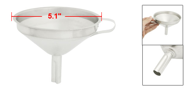 Product Name Filter Funnel Material Stainless Steel Color Silver Tone Mouth Outside Diameter 13cm / 5.1" Tip Outside Size 5 x 1.6cm / 2" x 0.63" (L*D) Total Length 12cm / 4.7" Net Weight 87g Package Content