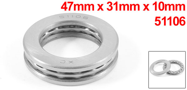 Details51106 47mm x 31mm x 10mm Single Direction Thrust Ball Roller Bearing  Product Name Thrust Ball Bearing Type 51106 Direction Single Material Carbon Steel Outer Diameter 47mm / 1.85" Inner Diameter 31mm/ 1.22" Thickness 10mm/ 0.39" Main Color Silver Tone Weight 63g Package Content 1 x Thrust Ball Bearing