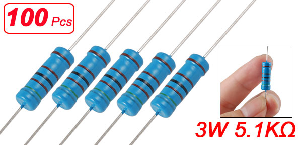 Product Name Metal Film Resistor Rated Power 3W Tolerance ± 1% Resistance Value 5.1KΩ T.C.R(Temperature Coefficient) ±50ppm/°C Body Size 5 x 16mm/0.2" x 0.61" (D*L) Leads Dia (Approx.) 0.5mm/0.019" Total Length (Approx.) 79mm/3.1" Color As Picture Shown Net Weight 143g Package Content 100 Pcs (± 2%) x Metal Film Resistors - Reviews