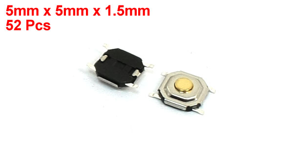 Details52PCS SMD SMT PCB 4 Terminals Momentary Push Button Tactile Switch 5x5x1.5mm  Product Name Tact Switch Acuion Type Momentary Voltage & Current AC250V 3A Switch Size(Pin not included) 5 x 5 x 1.5mm / 0.2" x 0.2" x 0.06"(L*W) Material Plastic, Metal, Electric Parts Color Black, Silver Tone Weight 5g Package Content 52(±2%) x Tact Switches