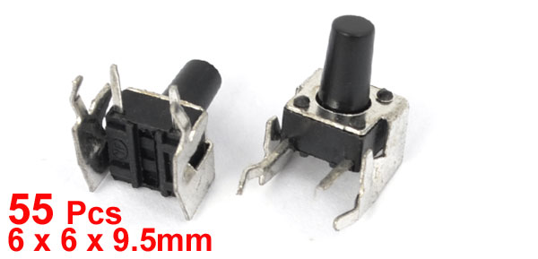 Product Name Tact Switch Action Type Momentary Total Size(Pin No Include) 6 x 6 x 9.5mm/0.24" x 0.24" x 0.20"(W*L*T) Button Size 3.5 x 6.5mm/0.14" x 0.26"(D*T) Mount Type DIP Material Plastic, Metal Color Black, Silver Tone Net Weight 27g Package Content 55 Pcs x Tact Switch - Reviews