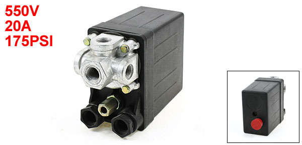 Product Name Air Compressor Pressure Switch Type Single Phase 4 Ports Max. Voltage 550V Max. Current 20A Pressure 175PSI, 12 Bar Female Thread Dia.(Each) 11mm Female Thread Size 1/4"NPT Inlet Hole Dia.(Each) 6mm/ 0.2" Inlet Thread Dia. 13mm/ 0.5" Total Size 14 x 9.3 x 5.8cm/5.5" x 3.6" x 2.3"(L*W*T) Button Diameter 2cm/ 0.78" Material Metal, Plastic Main Color Black, Red Weight 570g Package Content 1 x Air Compressor Pressure Switch - Reviews