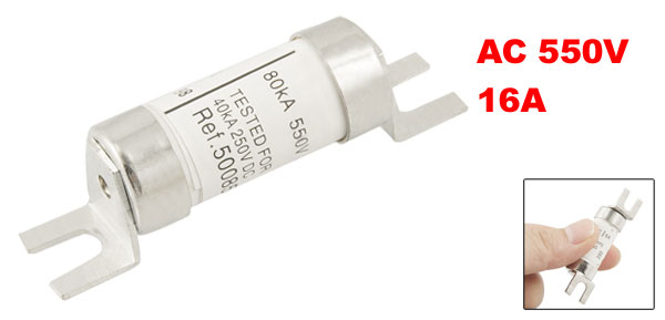 Product Name Fuse Link Model No. HRC NIT Type Fast Blow Rated Voltage AC 550V / DC 250V Rated Current 16A Breaking Capacity AC 80KA / DC 40KA Installing Hole Size 8 x 5mm/0.31" x 0.2"(L*W) Total Size 54 x 13.3mm/2.13" x 0.52"(L*W*T) Material Ceramic, Metal Main Color White Net Weight 16g Package Content 1 x Fuse Link - Reviews