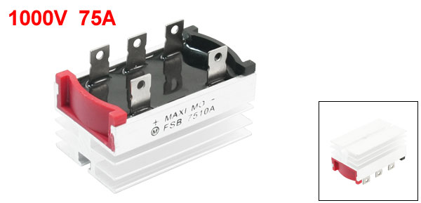 Product Name 3-Phase Bridge Rectifier w Heatsink Model No. 7510A Output Current(DC) 75A Repetitive Peak Reverse Voltage(AC) 1000V Working Temperature -40-+150°C Pin Number 5 Fixing Hole Diameter 5.5mm / 0.22" Overall Size(Pin not Included) 60 x 35 x 26mm/2.4" x 1.4" x 1"(L*W*T)