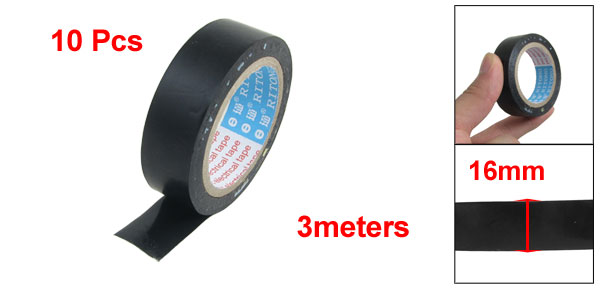 Product Name Electrical Insulation Tape Tape Width 16mm/ 0.6" Tape Thickness 6mm/ 0.2" Tape Length 3meters/ 118"/ 9.8 Ft Overall Diameter 55mm/ 2.2" Material PVC Color Black Weight 261g Package Content 10 x Adhesive Insulation Tape Roll - Reviews