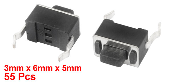 Product Name Tact Switch Action Type Momentary Total Size(Pin No Include) 3 x 6 x 5mm/0.12" x 0.24" x 0.20"(W*L*T) Button Size 3 x 1.5 x 2mm/0.12" x 0.06" x 0.08"(L*W*T) Mount Type DIP Material Plastic, Metal Color Black, Silver Tone Net Weight 9g Package Content 55 Pcs x Tact Switch - Reviews