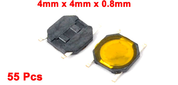Details55Pcs Momentary Tact Tactile Push Button Switch 4x4x0.8mm 4-pin SMD  Product Name Tact Switch Action Type Momentary Total Size(Pin No Include) 4 x 4 x 0.8mm/0.16" x 0.16" x 0.03"(L*W*T) Material Plastic, Metal Color Black, Silver Tone, Yellow Net Weight 3g Package Content 55 Pcs x Tact Switch
