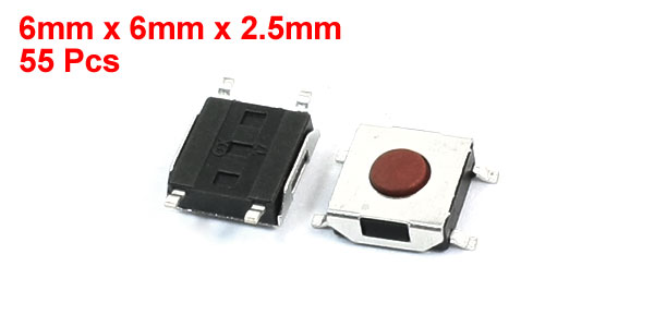 Product Name Tact Switch Action Type Momentary Total Size(Pin No Include) 6 x 6 x 2.5mm/0.24" x 0.24" x 0.10"(L*W*T) Button Size 3 x 1mm/0.12" x 0.04"(D*H) Material Plastic, Metal Color Black, Silver Tone, Red Net Weight 12g Package Content 55 Pcs x Tact Switch - Reviews