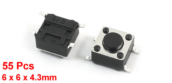 Details55Pcs Momentary Tact Tactile Push Button Switch 6x6x4.3mm 4-pin SMD  Product Name Tact Switch Action Type Momentary Total Size(Pin No Include) 6 x 6 x 4.3mm/0.24" x 0.24" x 0.17"(L*W*T) Button Size 3.5 x 1mm/0.14" x 0.04"(D*H) Material Plastic, Metal Color Black, Silver Tone Net Weight 13g Package Content 55 Pcs x Tact Switch