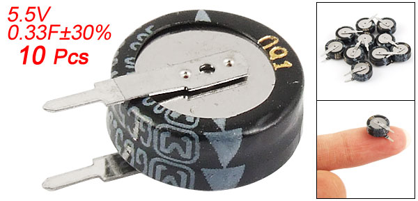 Product Name Super Capacitor Maximum Operating Voltage 5.5V Capacitance Value 0.33F Capacitance Tolerance ±30% Operating Temperature Range -25°C to +70°C ESR 75 Ω Terminal Type V Type Mounting Type Through Hole Lead Type Radial Lead Lead Sapcing 4.5mm / 0.18" Body Size (Approx.) 10 x 4mm / 0.39" x 0.16" (D*H) Total Height 13.5mm / 0.53" Weight 12g Package Content 10 Pcs x Coin Super Capacitors - Reviews