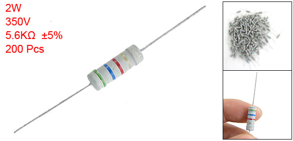 Product Name Carbon Film Resistors Material Type Carbon Film Rated Power 2W Resistance Value 5.6K ohm Tolerance ±5% Withstand Voltage 350V Total Size 60 x 5mm / 2.36" x 0.196" (L * D) Lead Diameter 0.4mm / 0.0157" Color As Picture Shown Weight 172g Package Content 200 Pcs (± 2%) x Carbon Film Resistors - Reviews