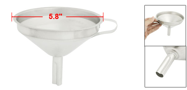 Product Name Filter Funnel Material Stainless Steel Color Silver Tone Mouth Outside Diameter 14.8cm / 5.8" Tip Outside Size 5.5 x 1.6cm / 2.2" x 0.63" (L*D) Total Length 13cm / 5.1" Net Weight 112g Package Content