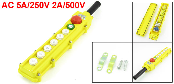 Product Name Hoist Push Button Switch Model No. COB-64BH Usage for Hoist Crane Features Rainproof, 6 Ways with an Emergency Stop Knob Contact Type Latching, Rotary Release(Emergency Stop Knob) Momentary(Other Push Buttons) Rated Voltage & Current AC 250V/500V, 5A/2A Overall Size(Approx.) 31 x 6 x 4cm / 12" x 2.4" x 1.6"(L*W*T) Jointing Sleeve Size 11 x 2cm / 4.3" x 0.8"(L*Dia.) Housing Material ABS Color Yellow Net Weight 505g Package Content 1 x Hoist Push Button Switch 1 x Jointing Sleeve - Reviews