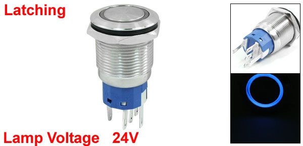 Item Name Push Button Switch Operation Type Latching Type LED Type Ring-illuminated LED Contact 1NO 1NC Pin Number 5 Head Design Flat Head Lamp Voltage 24V Switch Rating 250VAC, 5A LED Color Blue Thread Diameter 19mm/0.75" Total Size 40 x 22mm/1.6" x 0.9"(L*Max.W) Material Metal, Electric Parts Housing Color Silver Tone Weight 17g Package Content 1 x Push Button Switch - Reviews
