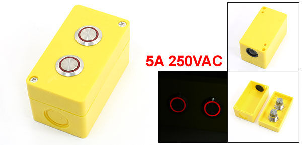 Product Name Push Button Station Action Type Momentary Round Flat Button Contact Type SPDT 1NC 1NO Working Voltage & Current 5A 250VAC Max. Withstand Current 19A Light Voltage 24V Light Color Red Button Dia 2.3cm/0.9" Overall Size 9 x 5 x 5cm/3.5" x 2" x 2"(L*W*H) Wire Hole Dia 20mm/0.78" Mounting Hole Dia 4mm/0.16" Mount Hole Distance 60mm x 35mm/2.4" x 1.4"(L*W) Material Plastic, Metal Color Red, Yellow, Silver Tone Net Weight 72g Package Content 1 x Push Button Station - Reviews