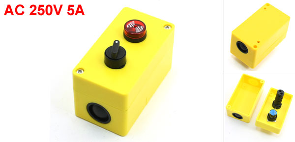 Product Name Push Button Station Action Type Black Rotary Switch and Red Buzzer Contact Type SPDT Working Voltage & Current 5A 250VAC Rotary Switch Position 2 Position Buzzer Voltage 24VAC/DC Button Dia 1.8cm/0.7"