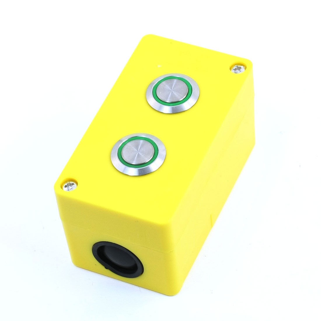 Product Name Push Button Station Action Type Momentary Latching Action Contact Type SPDT Working Voltage & Current 5A 250VAC Max. Withstand Current 19A Light Voltage 12V Light Color Green Button Dia 2.2cm/0.9" Overall Size 9 x 5 x 5cm/3.5" x 2" x 2"(L*W*H) Wire Hole Dia 20mm/0.78" Mounting Hole Dia 4mm/0.16" Mount Hole Distance 60mm x 35mm/2.4" x 1.4"(L*W) Material Plastic, Metal Color Yellow, Silver Tone, Green Net Weight 88g Package Content 1 x Push Button Station - Reviews