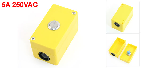 Product Name Push Button Station Action Type Momentary Contact Type SPST Working Voltage & Current 5A 250VAC Max. Withstand Current 19A Button Dia 2.3cm/0.9" Overall Size 9 x 5 x 5cm/3.5" x 2" x 2"(L*W*H) Wire Hole Dia 20mm/0.78" Mounting Hole Dia 4mm/0.16" Mount Hole Distance 60mm x 35mm/2.4" x 1.4"(L*W) Material Plastic, Metal Color Yellow, Silver Tone Net Weight 72g Package Content 1 x Push Button Station - Reviews