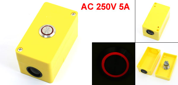 Product Name Push Button Station Action Type Momentary Action Contact Type SPDT 1NO 1NC Working Voltage & Current 5A 250VAC Max. Withstand Current 19A Light Voltage 12V Light Color Red Button Dia 2.3cm/0.9" Overall Size 9 x 5 x 5cm/3.5" x 2" x 2"(L*W*H) Wire Hole Dia 20mm/0.78" Mounting Hole Dia 4mm/0.16" Mount Hole Distance 60mm x 35mm/2.4" x 1.4"(L*W) Material Plastic, Metal Color Red, Yellow, Silver Tone Net Weight 72g Package Content 1 x Push Button Station - Reviews