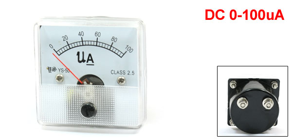 Product Name Analog Ammeter Model No. YS-50 Measuring Current Range DC 0-100uA Accuracy Class 2.5 Meter Face Size(Approx) 5 x 5 x 1.1cm / 2" x 2" x 0.4"(L*W*T) Thread Dia(Approx) Big One: 0.38cm / 0.150" Small One: 0.28cm / 0.110" Overall Depth 4.5cm / 1.8" Color Clear & White & Black Material Metal & Plastic Net Weight 63g Package Content 1 x Analog Ammeter Several Installing Parts - Reviews